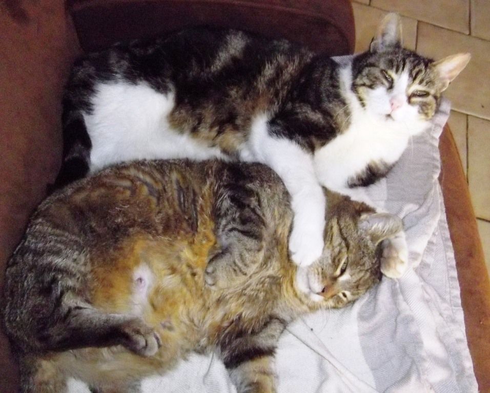 Encore un gentil couple. Fluffy, elle va sur ses 18 ans,pour elle chaque jour est un sursis. Lui c'est Noé, il a été castré . Un jour mon beau frère le pasteur me l'a apporté tout chaton. Il était avec sa petite soeur qui dés sa sortie de la boite à chat s'est enfuie et qu'on a jamais revue.